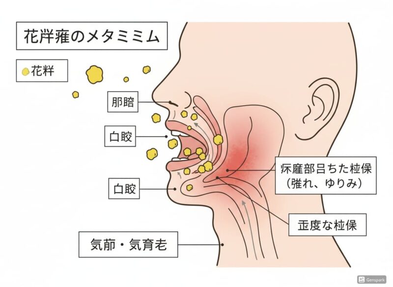 結論として、花粉が喉に付着することでアレルギー反応が起こり、炎症や痛みが発生します。